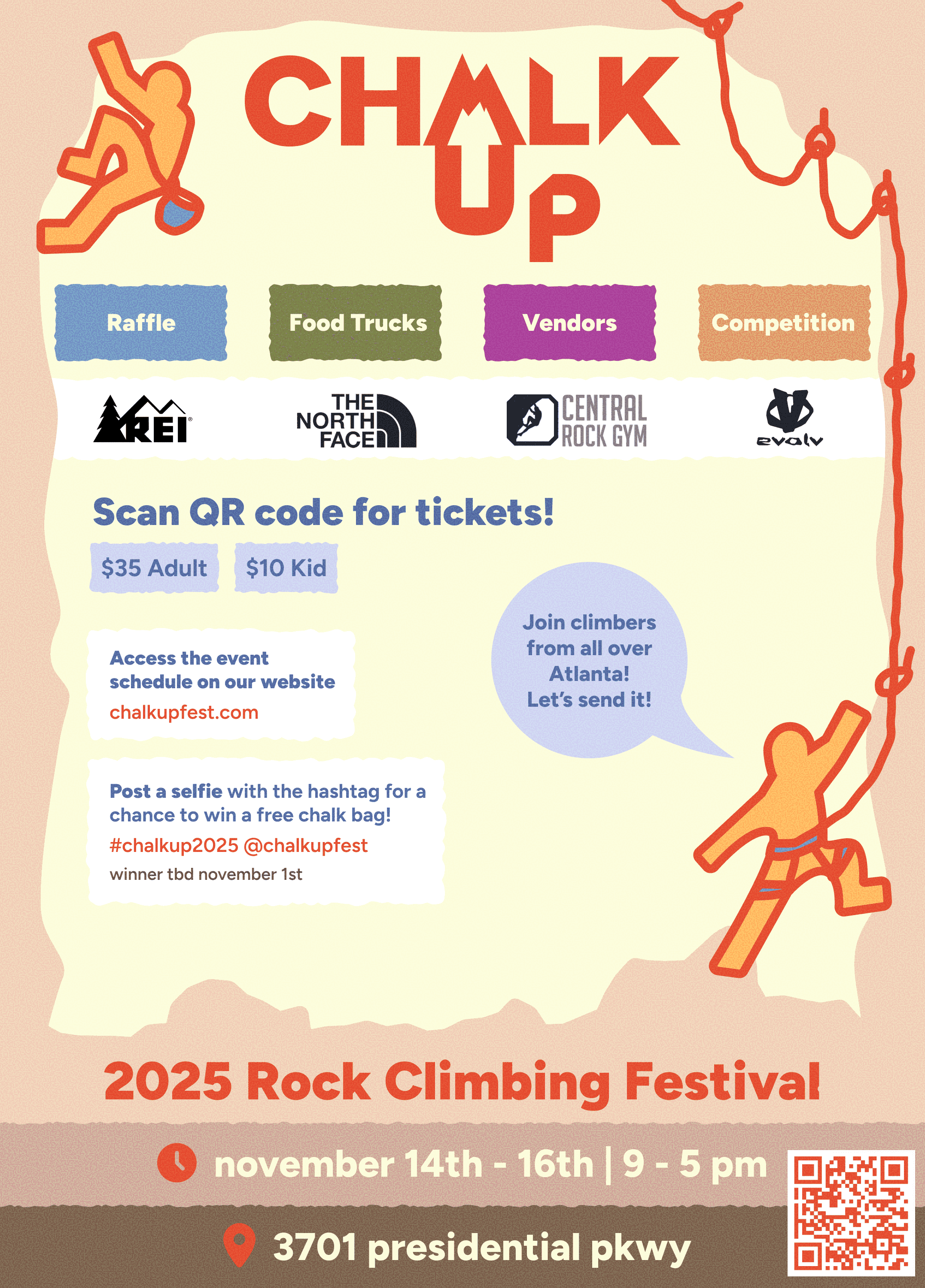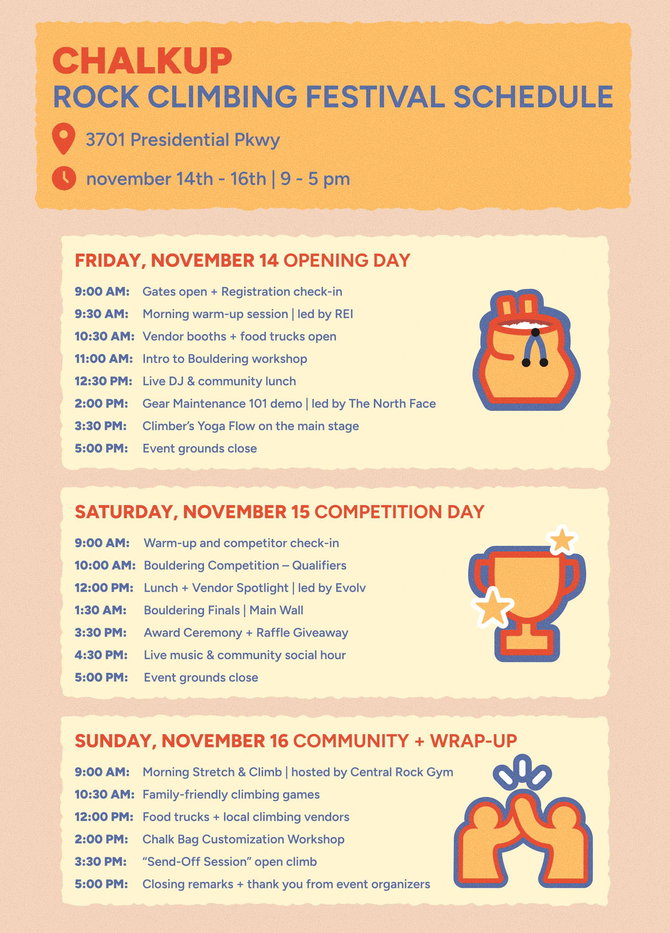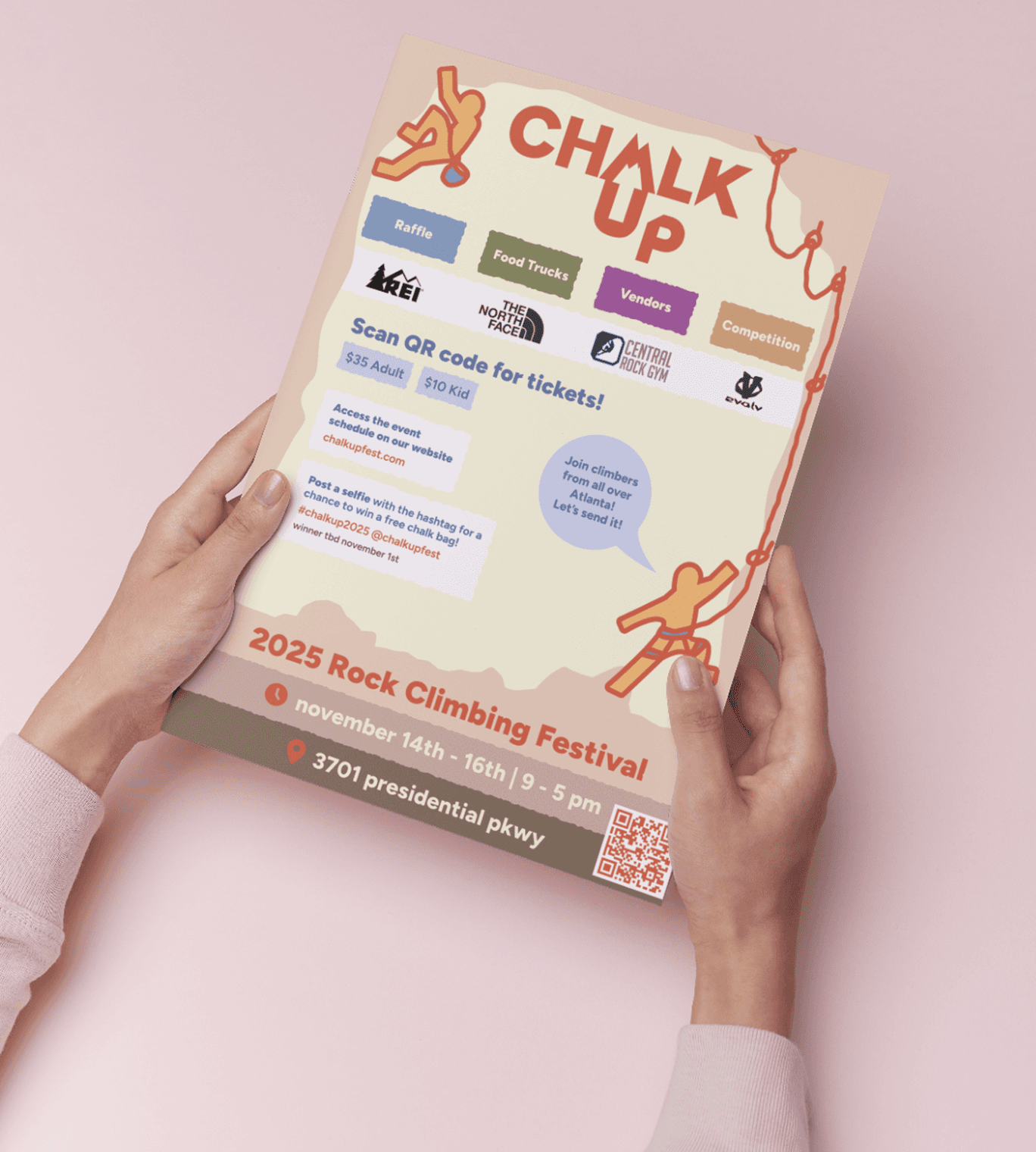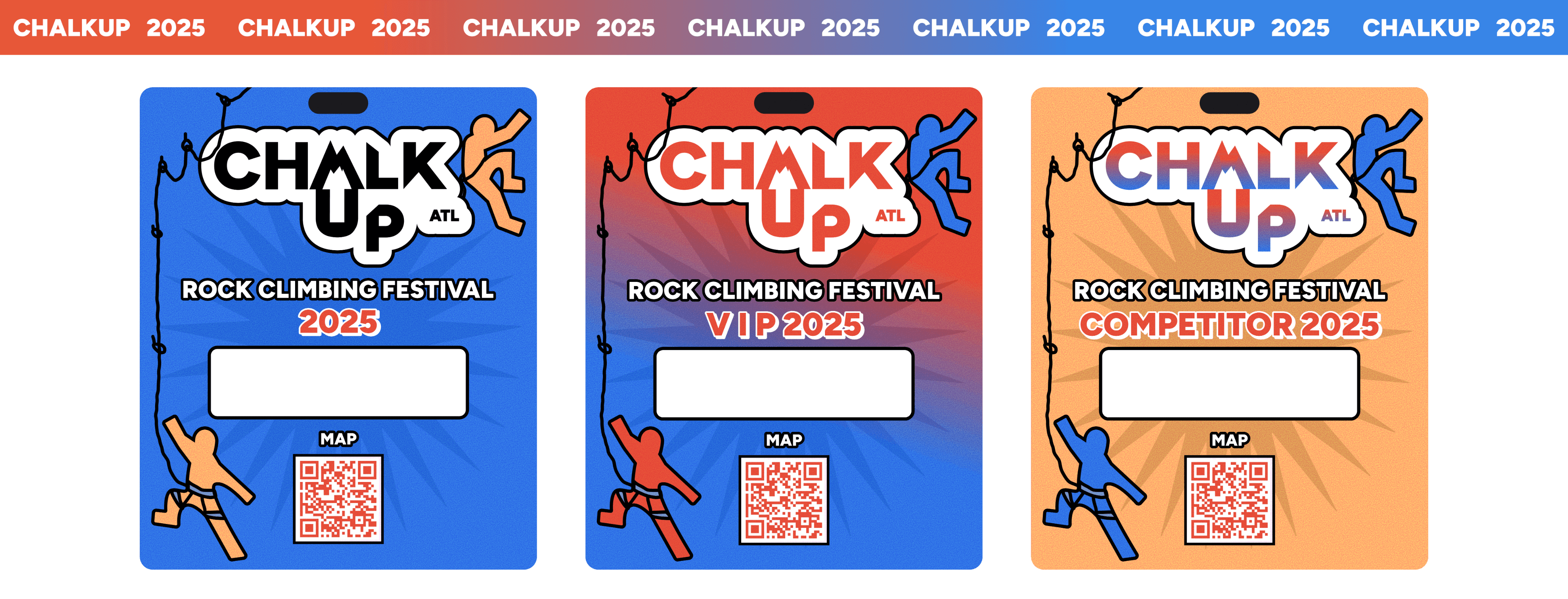 ChalkUp is a multi-day bouldering event with competitions, vendors, and outdoor activities. When I began climbing, I immediately noticed how collaborative the culture is. Climbers cheer for strangers and celebrate progress. I wanted my branding system to mirror that spirit: energetic, friendly, and approachable.